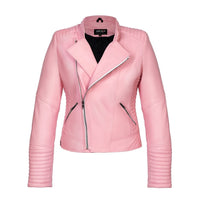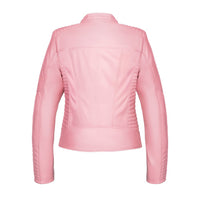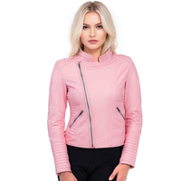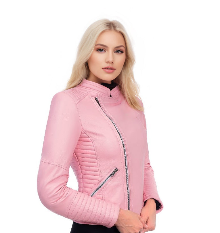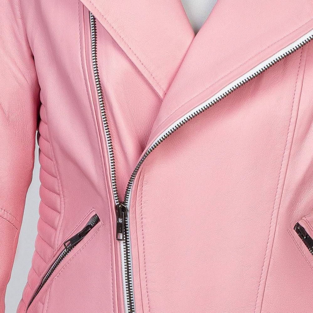 Această geacă din piele moto de damă, de culoare roz, feminină, lucrată manual la perfecțiune, este elegantă, confortabilă, cu protecție completă, la fel de bună pentru motociclism dar și pentru o noapte în oraș.