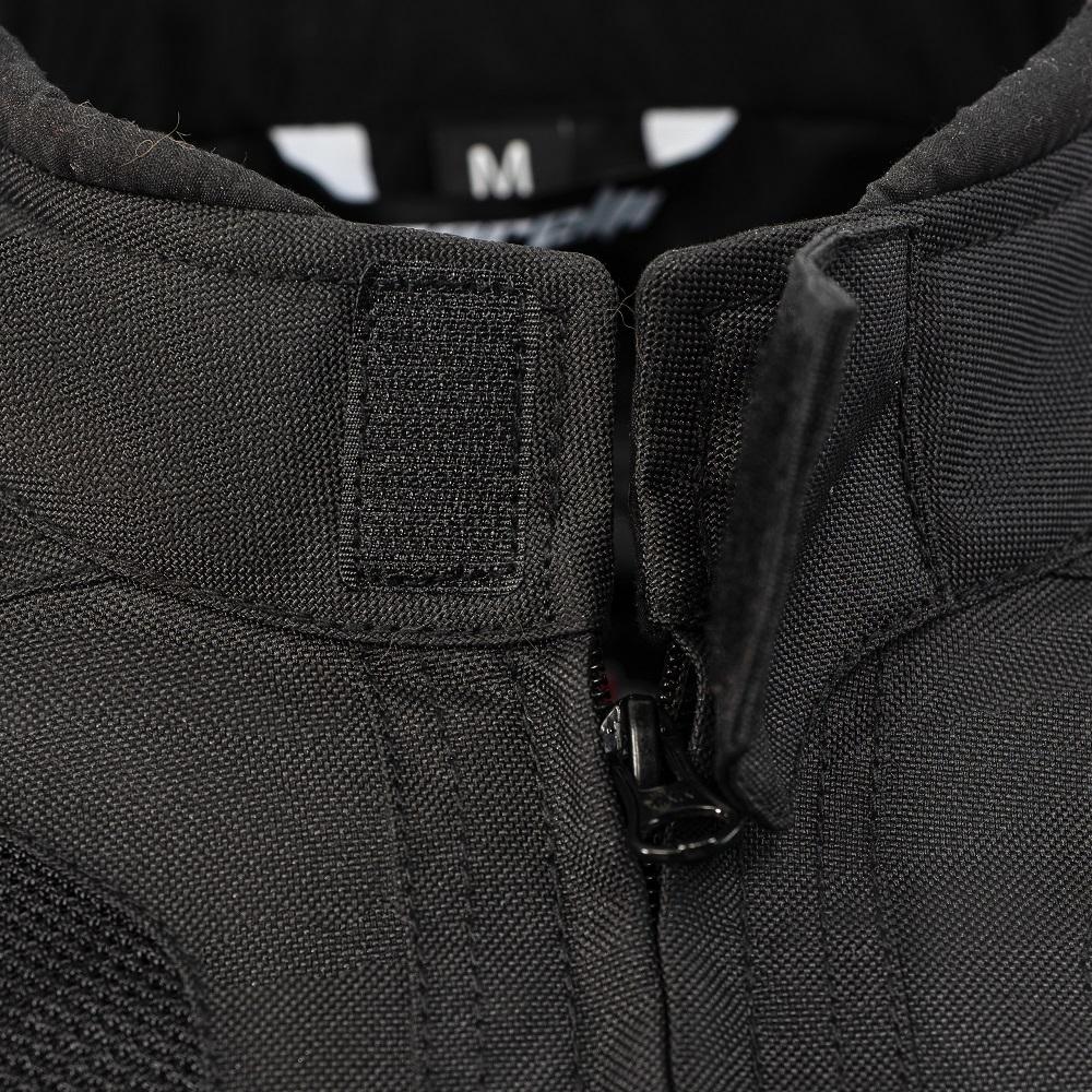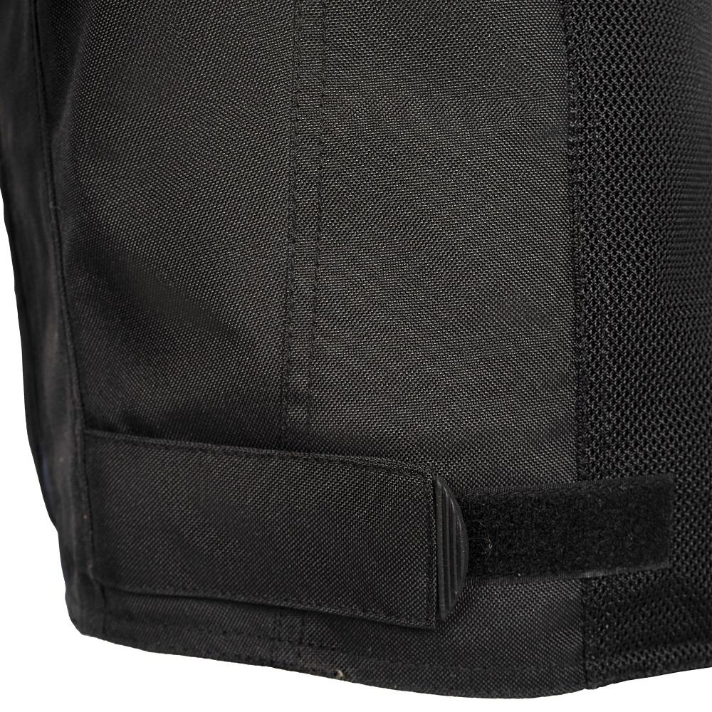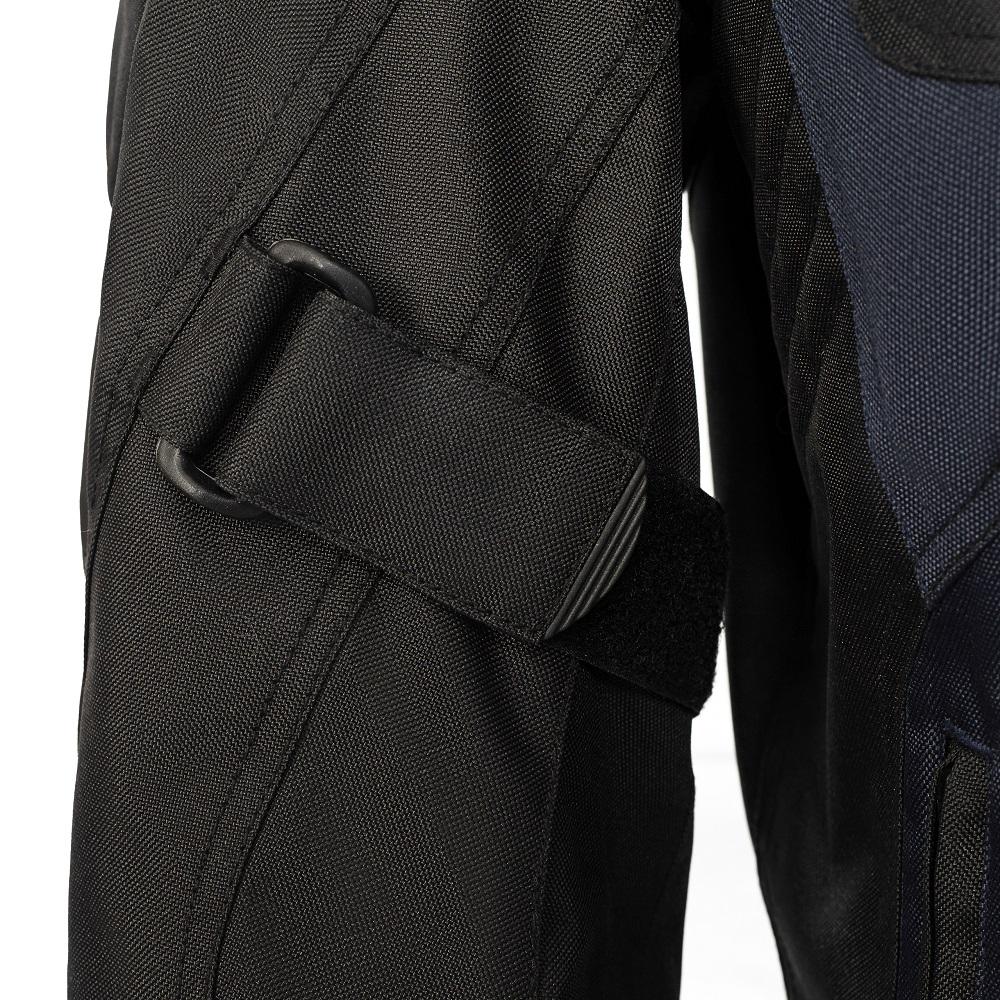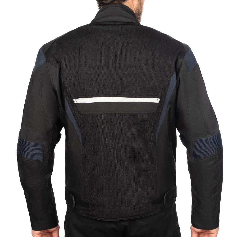Această geacă textilă ușoară, neagră cu panouri de culoare albastru închis, complet protejată, cu căptușeală interioară detașabilă, este perfectă pentru toate condițiile meteo! Are un spate perforat și două panouri perforate în față pentru ventilație.