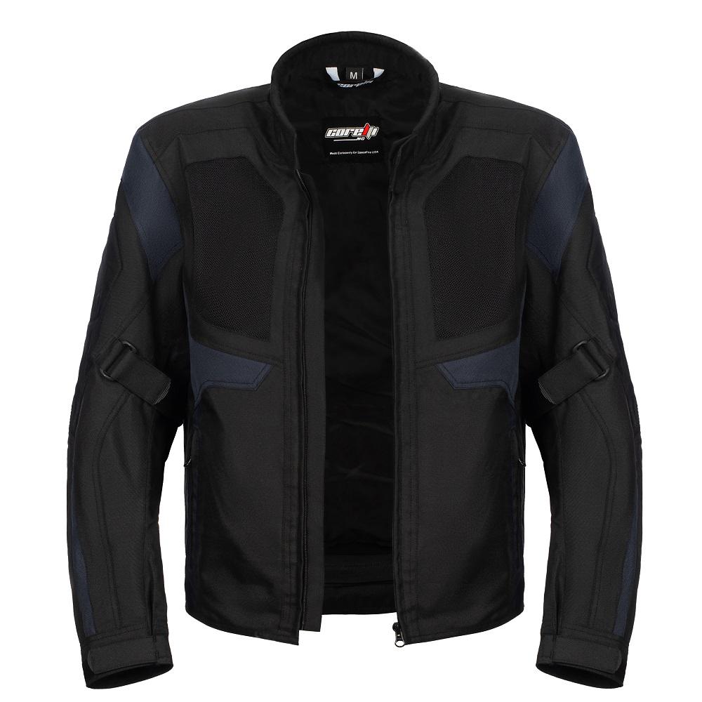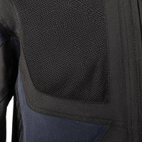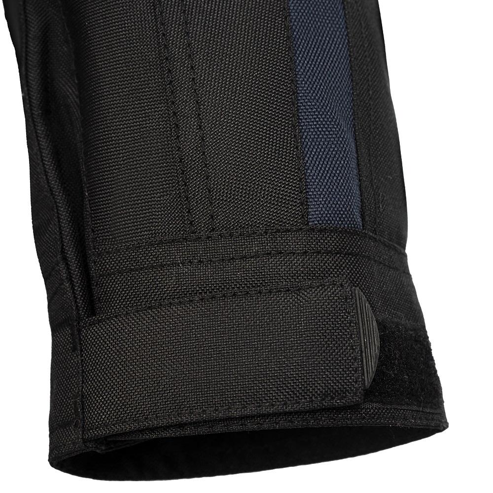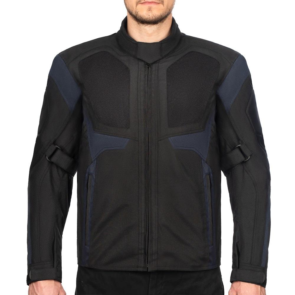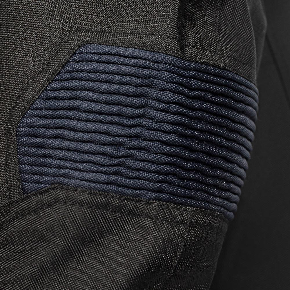 Această geacă textilă ușoară, neagră cu panouri de culoare albastru închis, complet protejată, cu căptușeală interioară detașabilă, este perfectă pentru toate condițiile meteo! Are un spate perforat și două panouri perforate în față pentru ventilație.