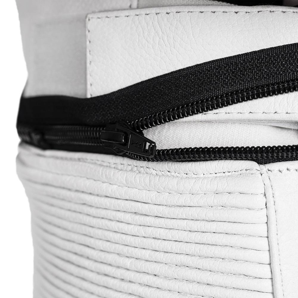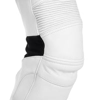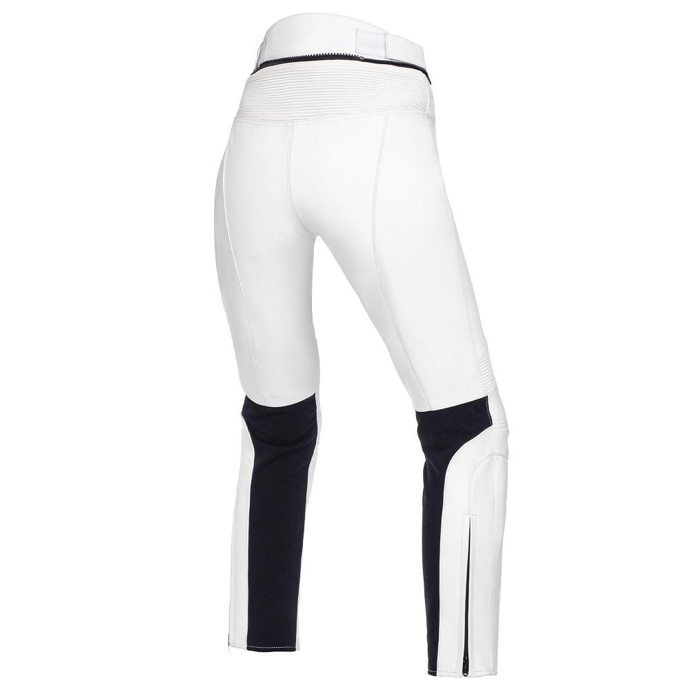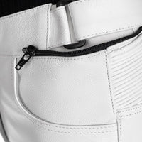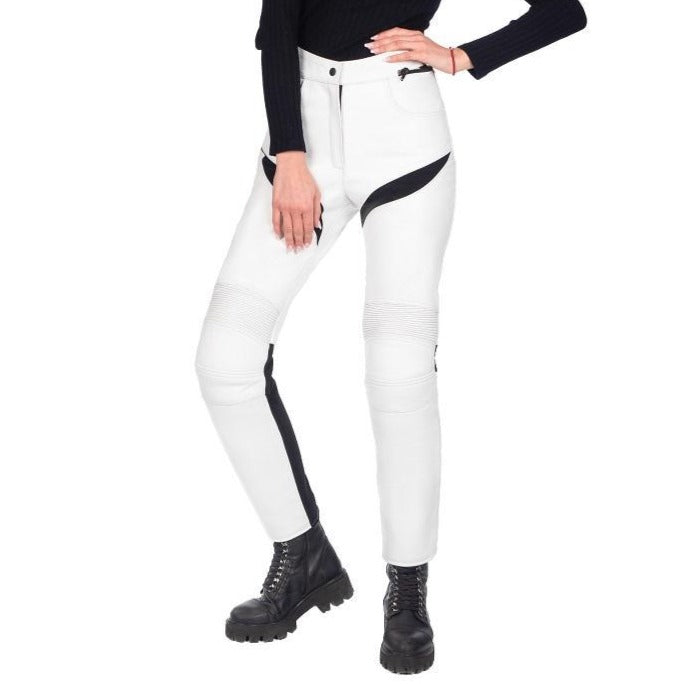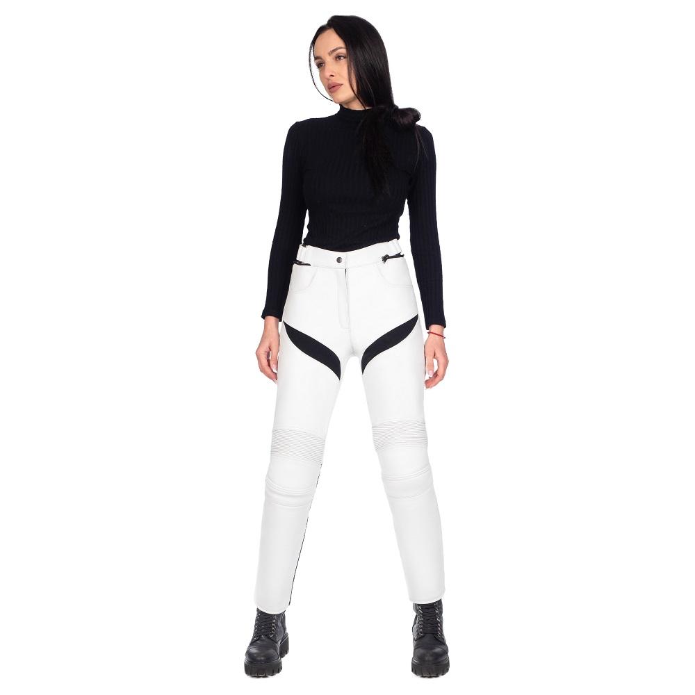 Acești pantaloni din piele albă sunt complet protejați pentru motociclism și oferă siguranță pe drum! Sunt confortabili, se potrivesc bine și vor întoarce privirile oriunde ai merge!